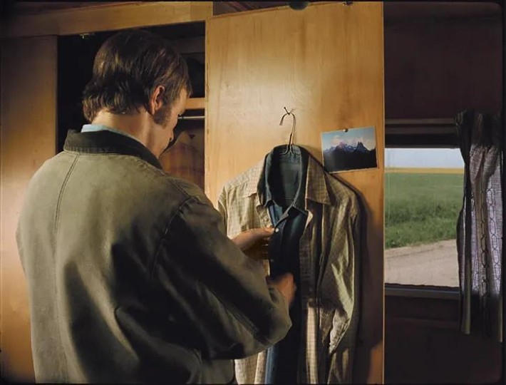 他镜头下的爱情没有激烈的宣言,只有无数的欲言又止:埃尼斯紧绷的下巴、杰克在电话那头的哽咽、帐篷里被风模糊的呼吸、衣橱里两件叠在一起的衬衫……沉默的细节比任何呐喊都更具穿透力。当观众看到埃尼斯望着断背山方向发呆,看到他把衬衫挂进衣橱时轻轻说的“杰克,我发誓…”,感受到的是失去挚爱的痛苦和压抑带来的无尽遗憾。
